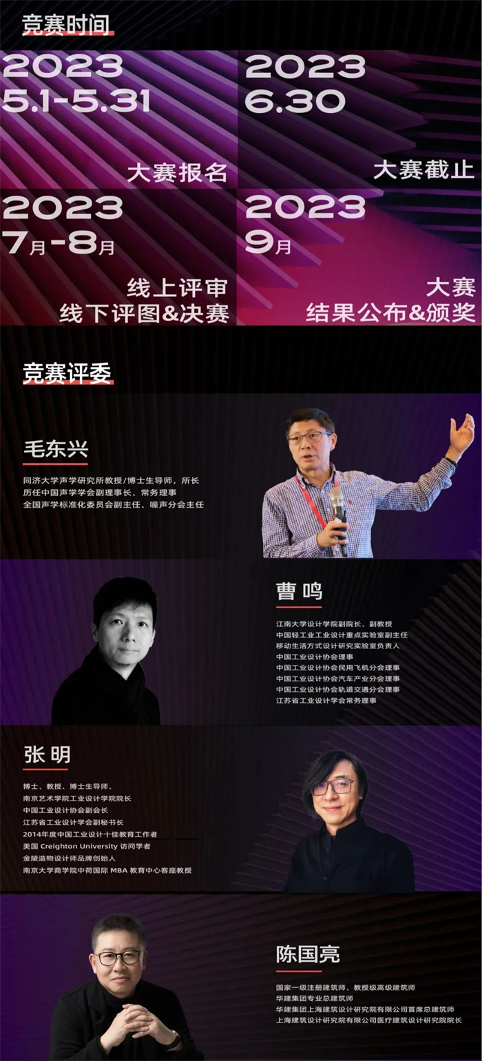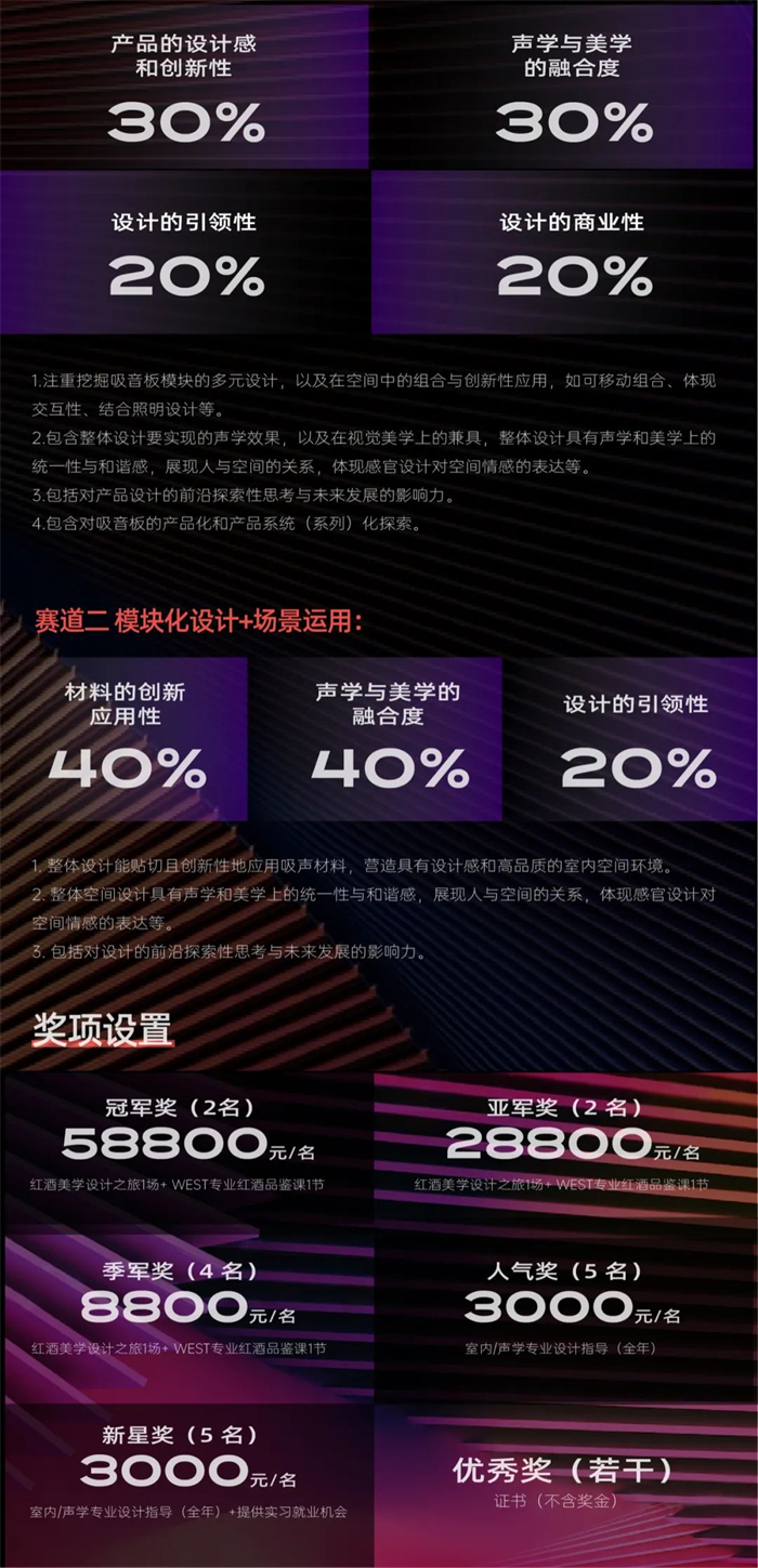 2023“聲學(xué)遇見美學(xué)”設(shè)計藝術(shù)大賽邀請你的閃亮登場!這是一次從吸聲材料的打破常規(guī)(設(shè)計思維)到美學(xué)升級,再到室內(nèi)設(shè)計創(chuàng)新應(yīng)用的探索之旅,是營造“大音希聲,大美無形”之空間意境的高手切磋!