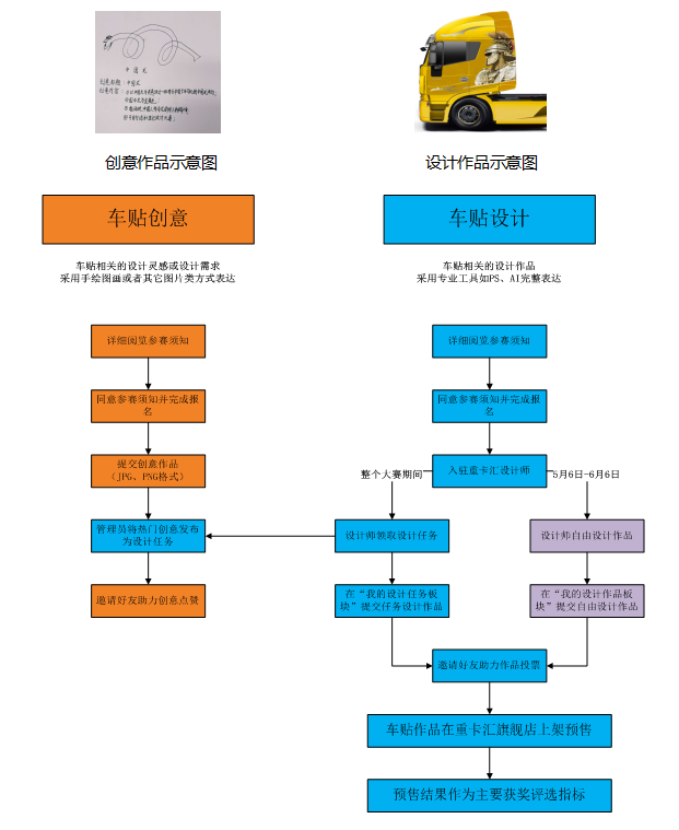 本次大賽參賽作品共分為車貼創意和車貼設計兩種,作品示意及參賽流程如下: